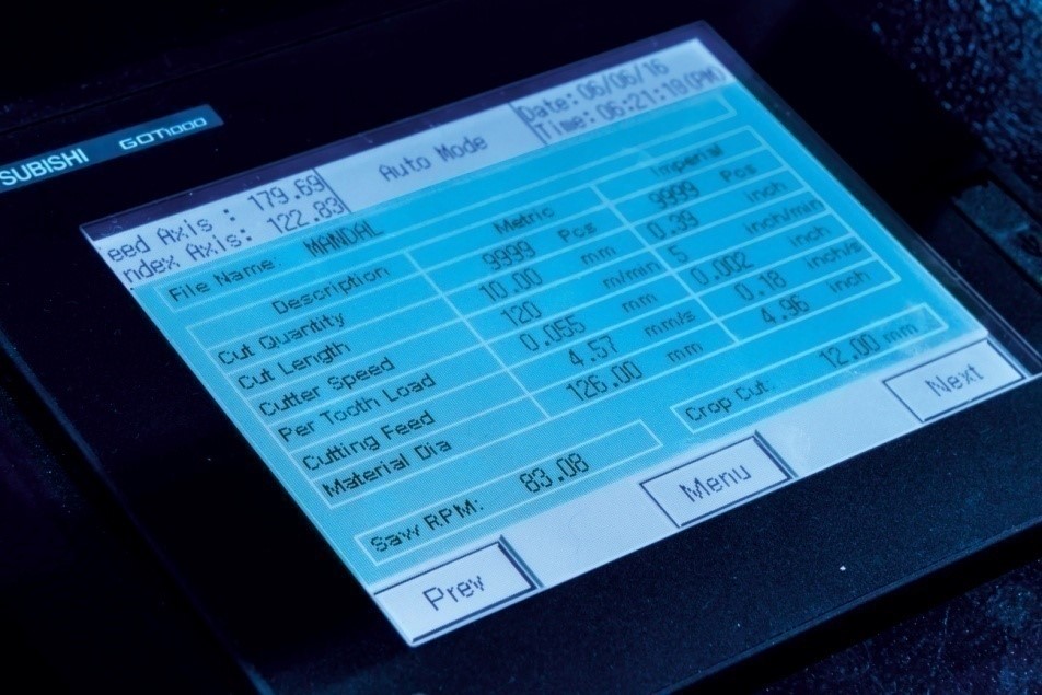 PLC & Colour touch screen HMI (Mitsubishi): easy operation and maintenance, HMI display features cut completed, program number in use, current drawn by motor with adjustable overload shut-off, feed rate, load per tooth, blade speed, number of cuts to be cut, job size, cut length can be set, cutting time, cycle time & number of cuts completed.