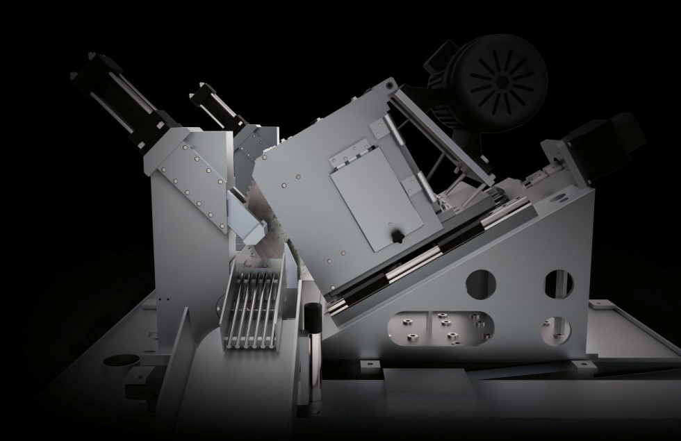 Electric motor is directly coupled to the reduction Gear Box trough-timing pulley & Belt and inclined cutter drive arrangement is mounted on inclined Linear Guides in order to have the most suitable touch of the blade into the material.