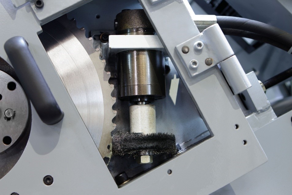 Hydraulic wire chip brush for constant removal of chips from the blade teeth granting a longer blade life.