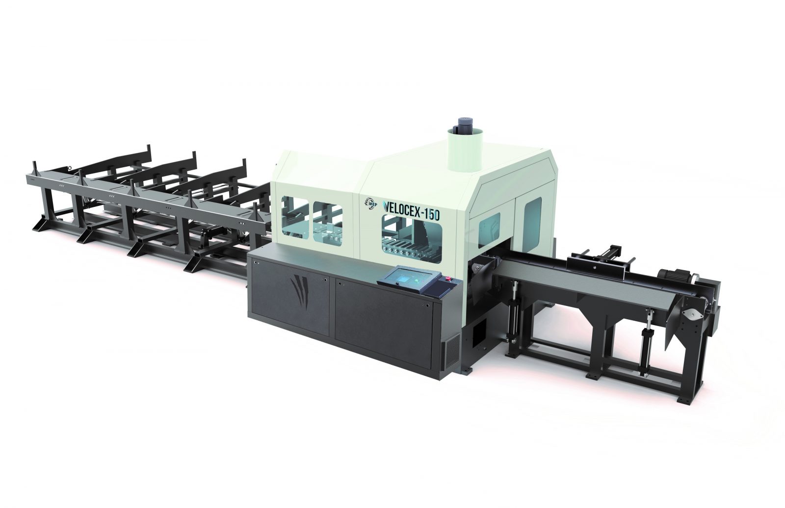 Material feed carriage mounted on linear guides, driven by a ball screw and AC servo drive.